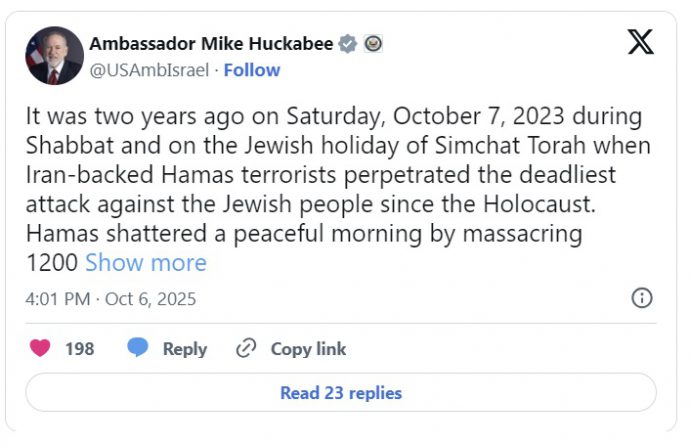 “Two years ago, during Shabbat and the joyous festival of Simchat Torah, Hamas—backed and financed by Iran—unleashed the deadliest attack on the Jewish people since the Holocaust,” Huckabee wrote. “That peaceful morning was shattered as 1,200 innocent Israelis were slaughtered and over 250 people, including Americans, were dragged into Gaza’s terror tunnels.”