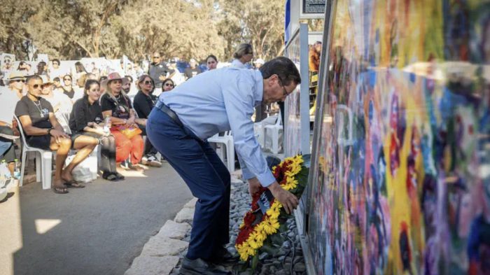 “We gather here in memory and in sorrow, remembering our loved ones who came to celebrate nature and love and music — and who were barbarically assassinated by Hamas terrorists. From that darkness rose the courage of our soldiers, the heroism of our citizens. We will not rest. We will not be silent until all 48 hostages are home.”