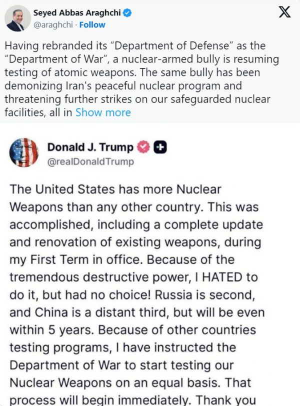 “Having rebranded its ‘Department of Defense’ as the ‘Department of War,’ a nuclear-armed bully is resuming testing of atomic weapons,” Araghchi posted on X, accusing the U.S. of hypocrisy for criticizing Iran’s so-called “peaceful” nuclear program while allegedly violating international norms.
