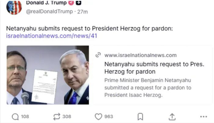 In mid-November, President Herzog received an official signed letter from Trump urging him to consider a pardon for Netanyahu. Trump emphasized that while Israel’s judicial independence must be respected, the case against Netanyahu reflects political motivation, not justice: