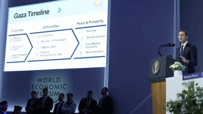 At the World Economic Forum in Davos, Jared Kushner, senior adviser and son-in-law of Donald Trump, formally unveiled the “Free Market Gaza” vision under the newly established Gaza Board of Peace. The proposal outlines a USD 25 billion investment-led reconstruction model, positioning Gaza as a future economic hub rather than a perpetual conflict zone.